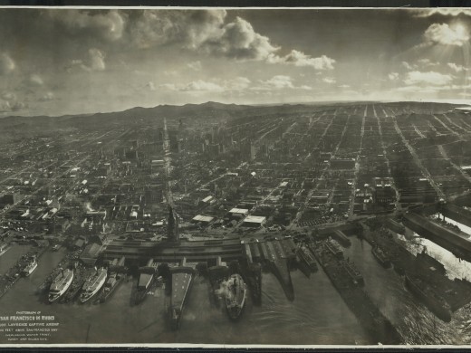 The image shows San Francisco after the big earthquake in 1906. The original scan is a 156MB TIF which I converted into the 13MB JPEG shown above. The image dimensions are 11709×4716 pixel (about 55 Megapixel).