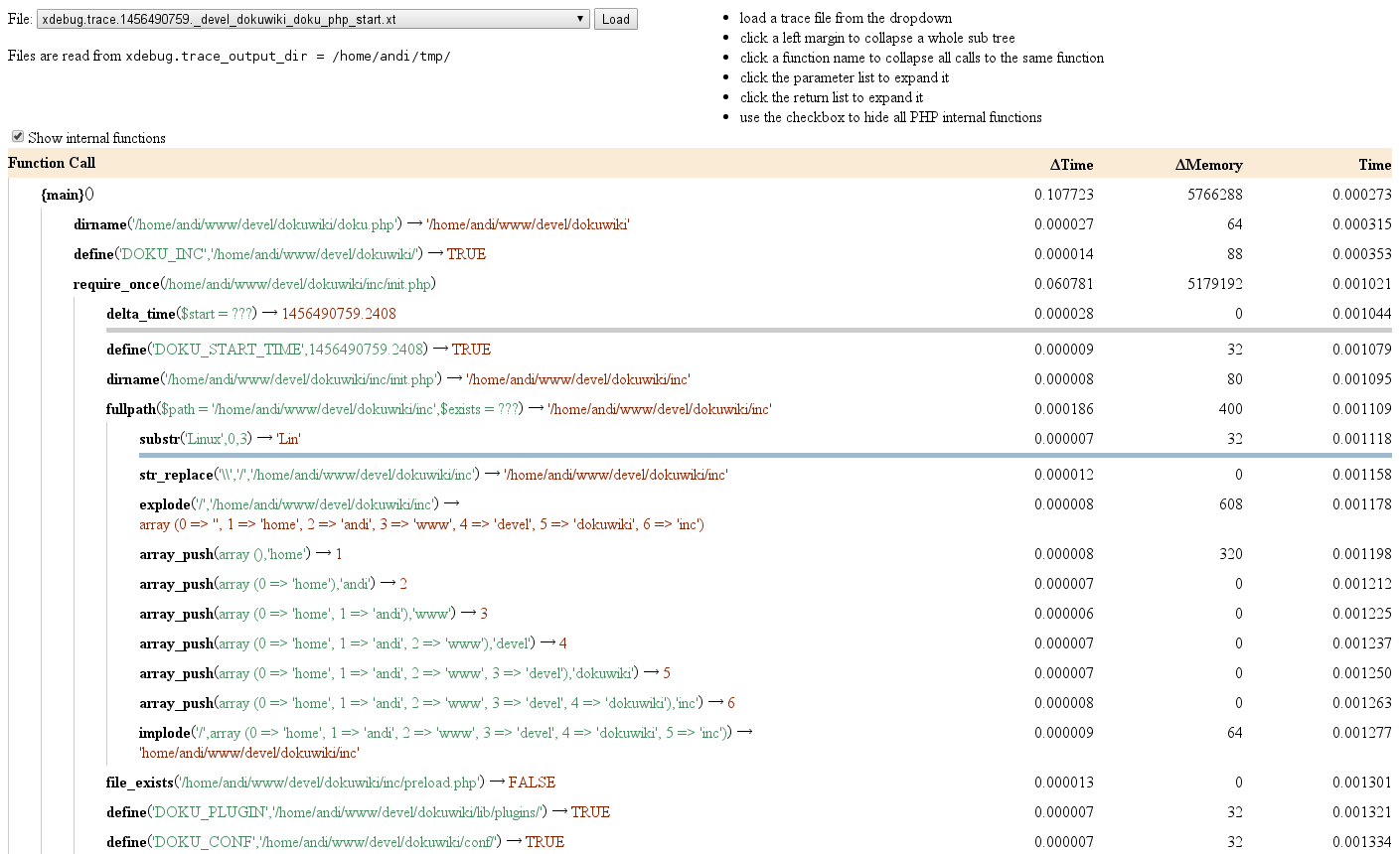However for what I want, I found the human readable formats much too verbose. A full function trace of a page load in DokuWiki has about 25k lines.