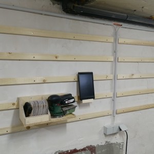 For the workshop proper, I finally came around to install a French cleat system. It's a simple way to add tool holders to the wall and still be flexible to move them around when you need to reorganize.