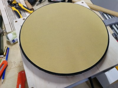 The disc is roughly 230mm so standard 225mm sand paper fits very well. The attachment is done via an adhesive velcro pad.