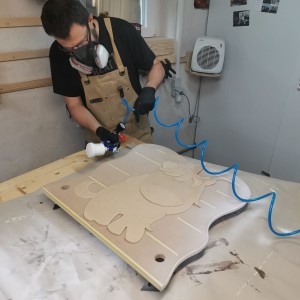 I suggested to give the unicorn a 3D effect instead of just painting it on. Three layers of 4mm MDF were cut on the band saw to form the different unicorn parts. The base plate is 18mm MDF and the individual shelves got cut from 15mm MDF.